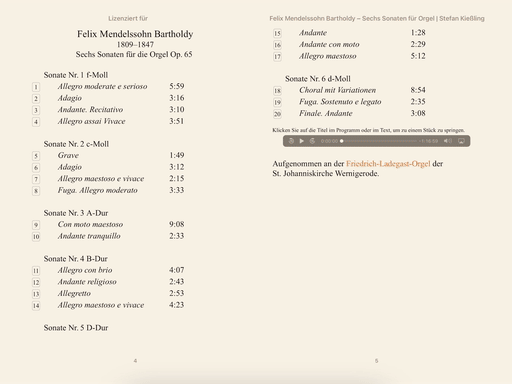 77‘ total playing time. Detailed accompanying booklet in German and English with text by Ekkehard Krüger, pictures, organ photos, organ disposition. The e-book contains also two video clips.